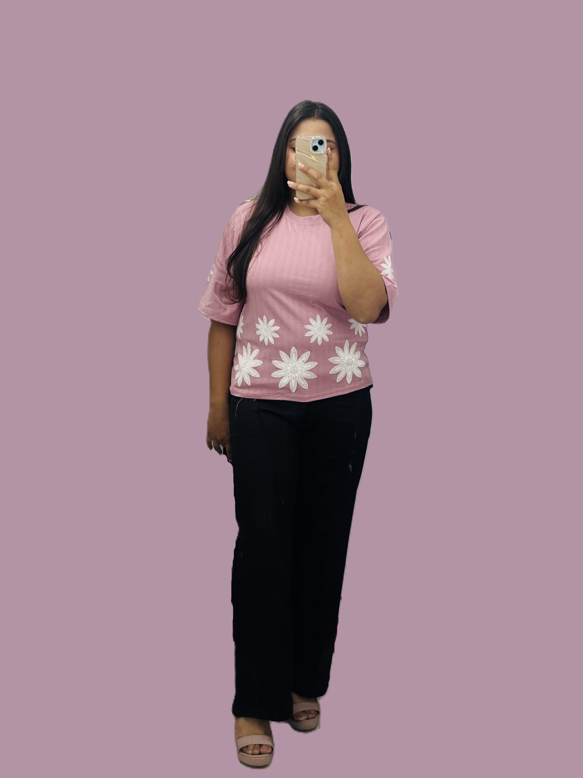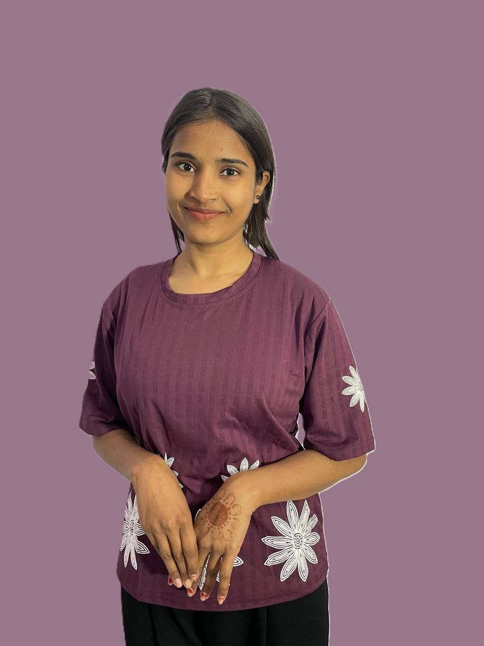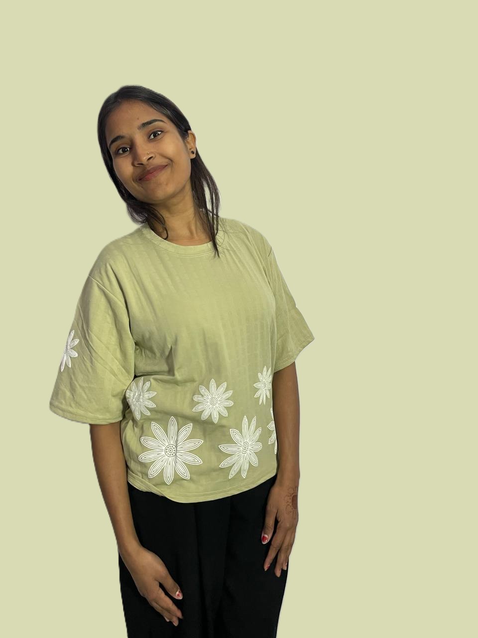 Trendy rubber printed drop shoulder t-shirt for women featuring a relaxed fit and soft fabric—perfect for casual wear, college, and street-style fashion.